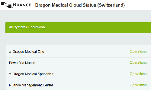Dragon Medical cloud services provide real-time speech recognition for Dragon Medical One as well as hundreds of partner applications. At Nuance, we recognize the critical role of real-time speech recognition in creating robust clinical documentation and delivering timely, personalized patient care. In order to provide complete transparency, this status page provides insight into the overall uptime of our Dragon Medical cloud services. You can subscribe for service status updates over email, or use this status dashboard to determine the health of our cloud services on-demand.